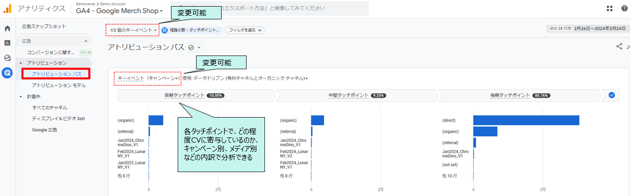 キーイベント(CVイベント)を絞っての表示も可能なので、キーイベントを複数設定している場合は、それぞれに対する貢献度を分析するのもよいでしょう。