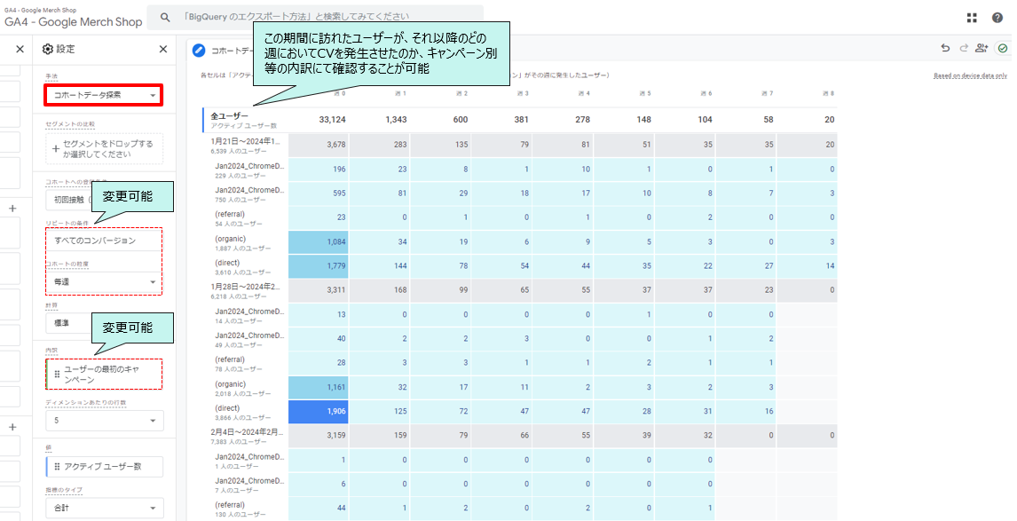 コホートとは、同じ属性や特徴を持つユーザーグループを意味します。このレポートではたとえば、ユーザーがサイトに初回接触した週でコホートを作成し、接触した週以降の週ごとのCVイベントを発生させたユーザー数を確認できます。