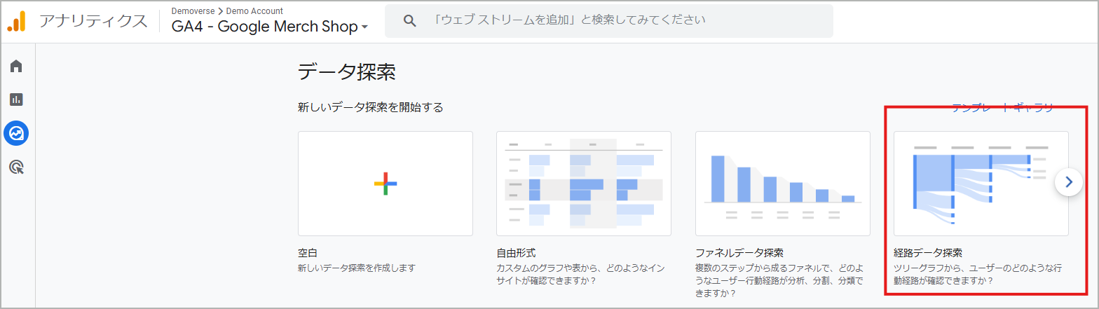 経路データ探索レポートを作成するには、GA4の「探索」から「経路データ探索」を選択します。