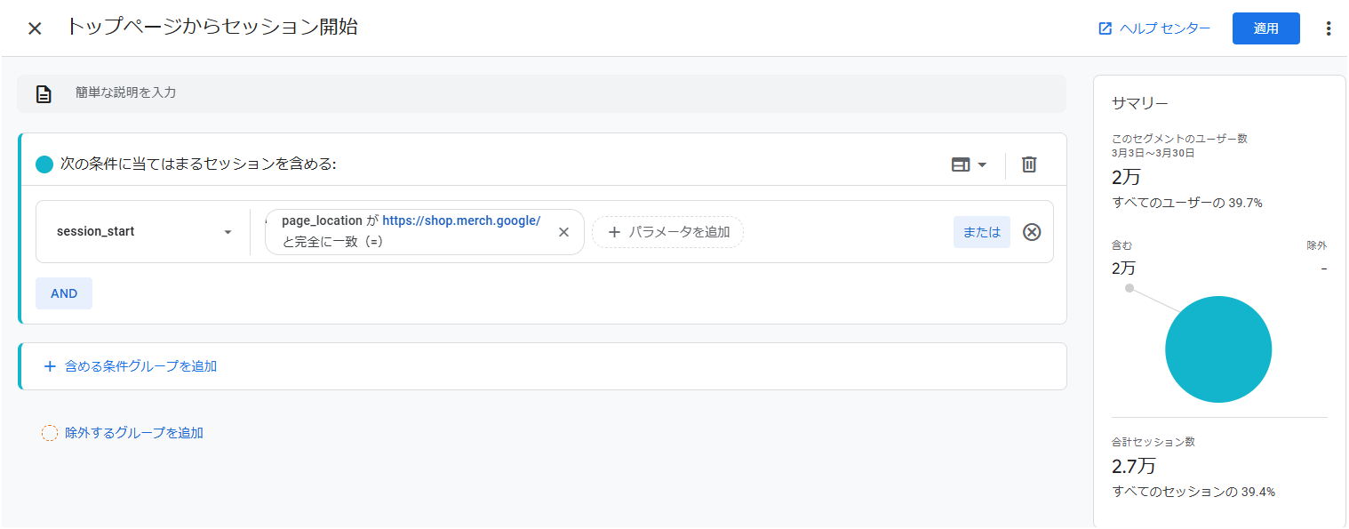 - セッションセグメントで「session_startイベント」とパラメータ「page_location」を設定(セッション開始時のページを指定)