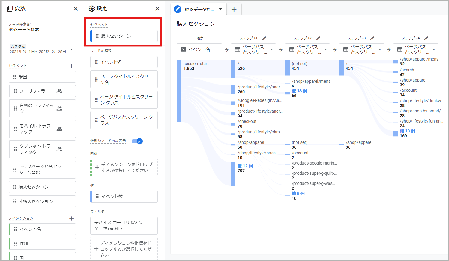 コンバージョン(CV)したユーザーと、そうでないユーザーの遷移パターンを比較するには、「経路データ探索」が非常に有効です。