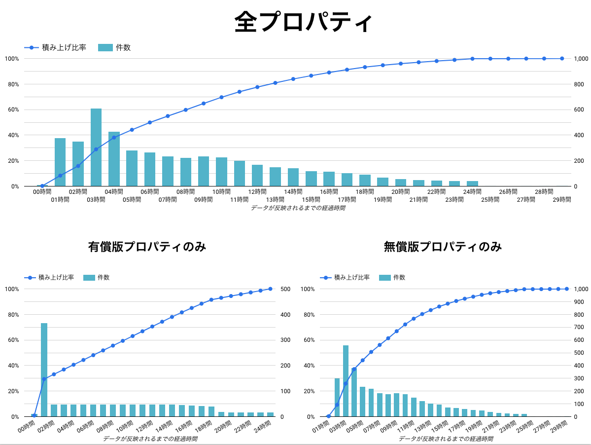 - 有償版プロパティでは、1時間以内にレポート生成されるケースが多く、無償版プロパティでは2〜4時間でレポート生成されるケースが多い。