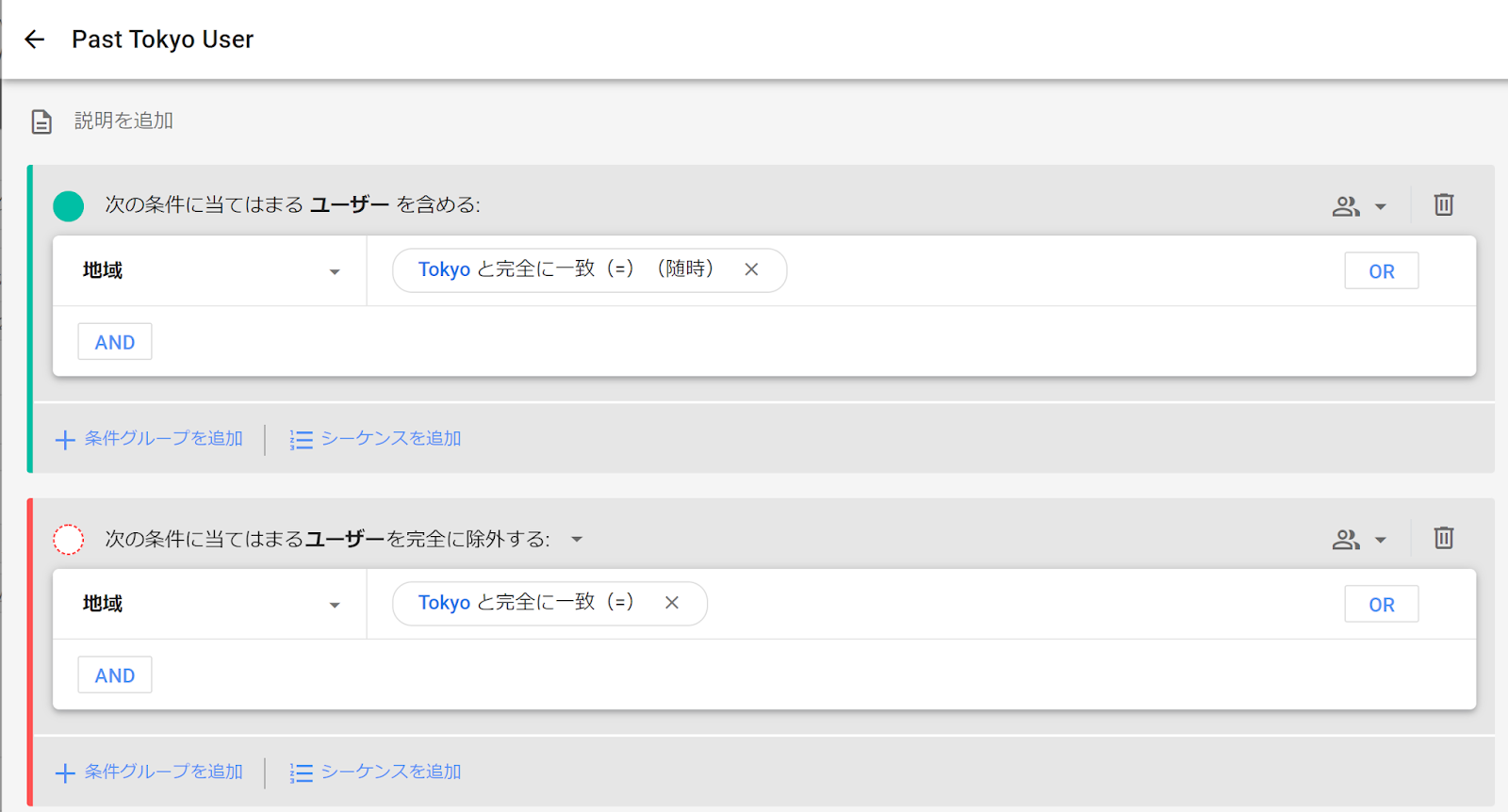 上記を理解すると、以下のような「過去にTokyoからサイト利用したことがあるが、最新のサイト利用はTokyoからではない」のような複雑なセグメントも作成できるようになります。
