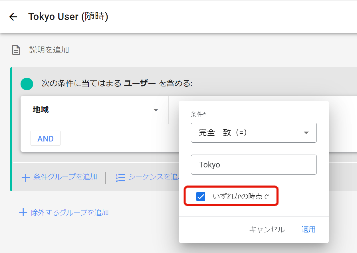ユーザーセグメントを作成するときに、おそらく多くの読者の皆さんが混乱するのは、オプションとして「いずれかの時点で」(下図)をチェックするとどのような動作をするのか(言い換えれば、チェックしなければどのような動作をするのか)分からない。ということではないかと思います。