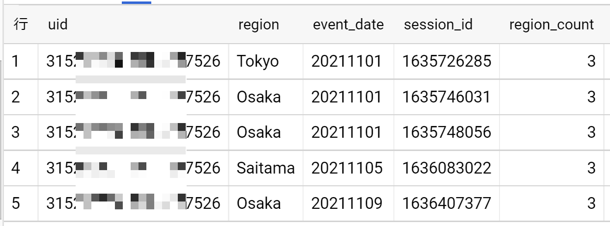 実際に以下のユーザーは、11月1日~9日の間に5セッションを発生させましたが、地域はTokyo、Osaka、Saitamaの3箇所に渡っています。