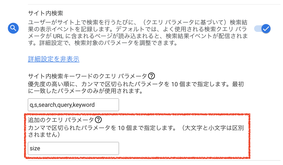最後に、これは注意点ではなくプラスアルファの話ですが、検索キーワードに追加して絞り込み検索を行うことができるサイトの場合、オプション機能の「追加のクエリパラメータ」を設定することで、絞り込み条件に何が使われたのかを計測することも可能です。