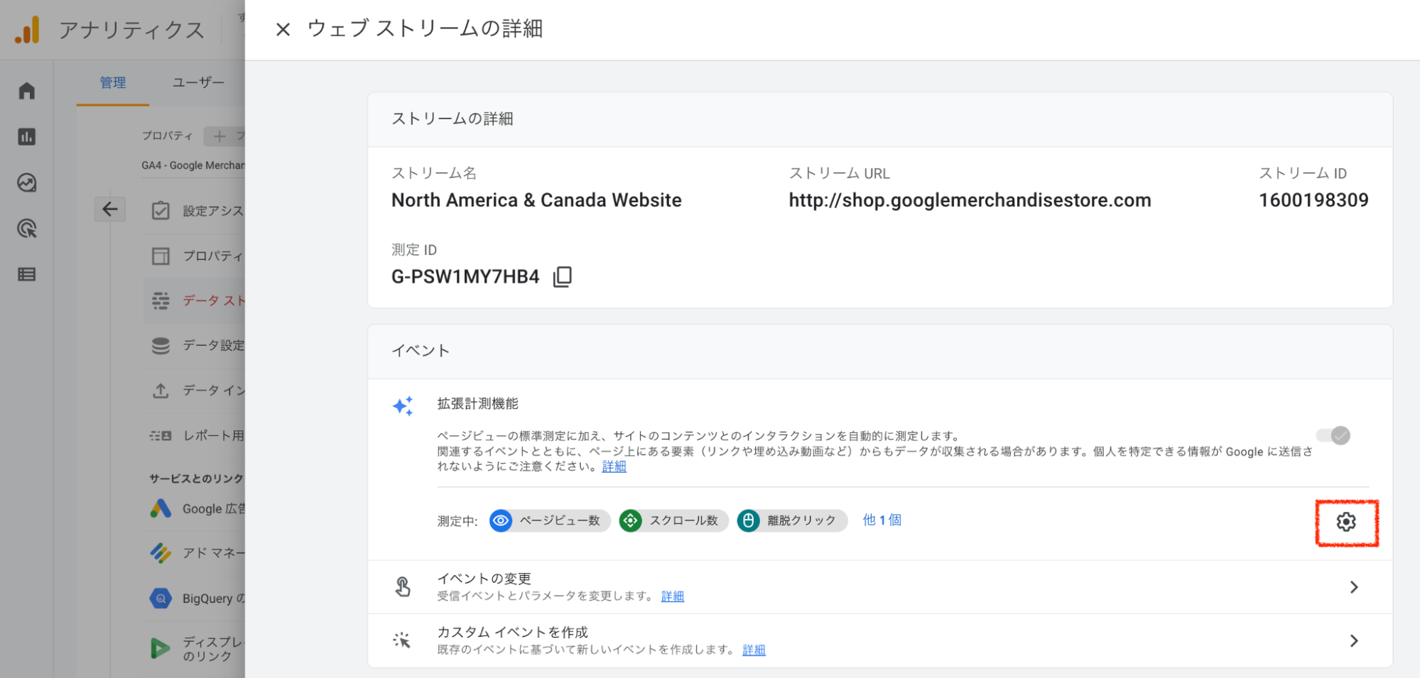 ※拡張計測機能は、管理>データストリーム>任意のウェブのデータストリームを選択し、拡張計測機能セクションの歯車マークをクリックすると開くことができます。