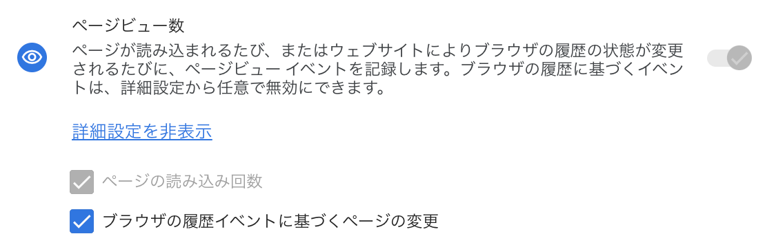 拡張計測機能で計測できるイベントにはpage_viewも入っており、これは単に一般的なページの読み込みが計測できるだけではありません。SPA(Single Page Application)のような動きをするサイトで、ブラウザの履歴イベント(History Change)によるページコンテンツの表示があった場合にも、page_viewを計測することができるオプション「ブラウザの履歴イベントに基づくページの変更」があります。