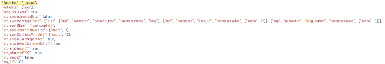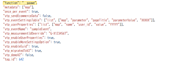 今回は文字列を値としていますが、本来は変数を指定しているケースが多いはずです。変数はmacro+ナンバリング(例: ["macro", 5])で表現されます。変数の設定内容を確認する場合は「"function": "__v"」等で検索することで確認できますが、変数タイプによってfunctionが異なるため注意が必要です。