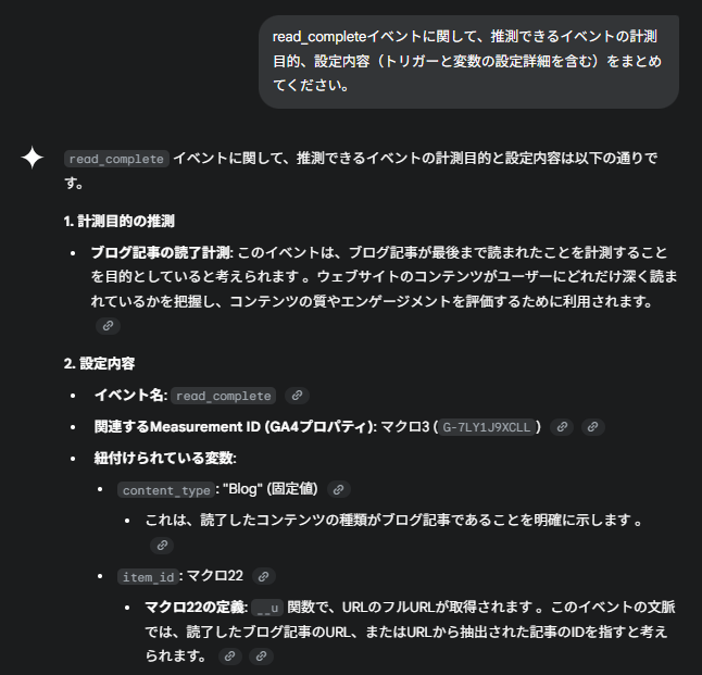 そんな時には、AIの登場です。GTMのjsライブラリをエクスポートし、Gemini等に解析依頼をしてみましょう。一覧を作成することもできますが、膨大な量となるため、今回は先ほど確認したread_completeイベントを対象に依頼を行います。