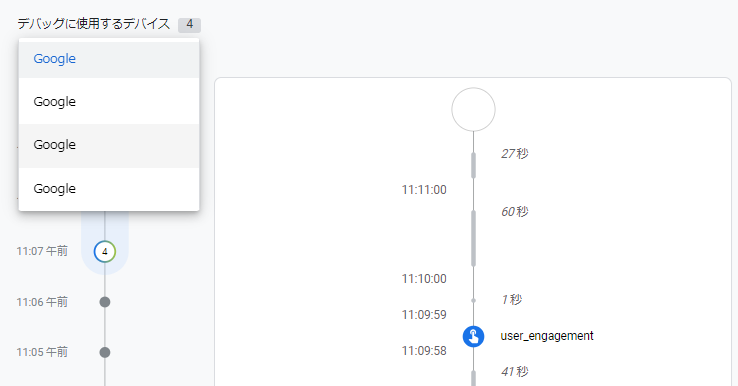パラメータ「debug_mode: true」を設定しイベント発火時に一緒に送信されるように設定すると、リアルタイムレポートのデータをデバイス別に [DebugView] で確認できるようになります。