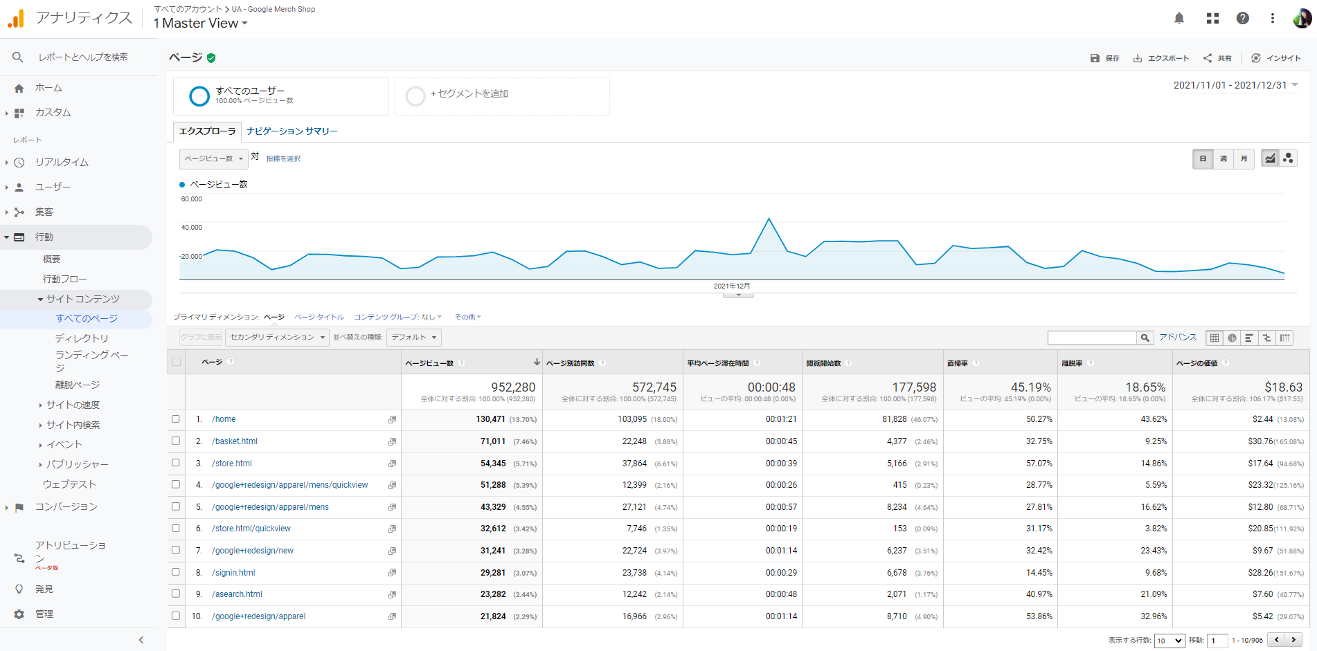 全体売上や特定の商品データを見るなら、標準レポートの [eコマース購入数] レポートを使っていただくのがベターだと思います。