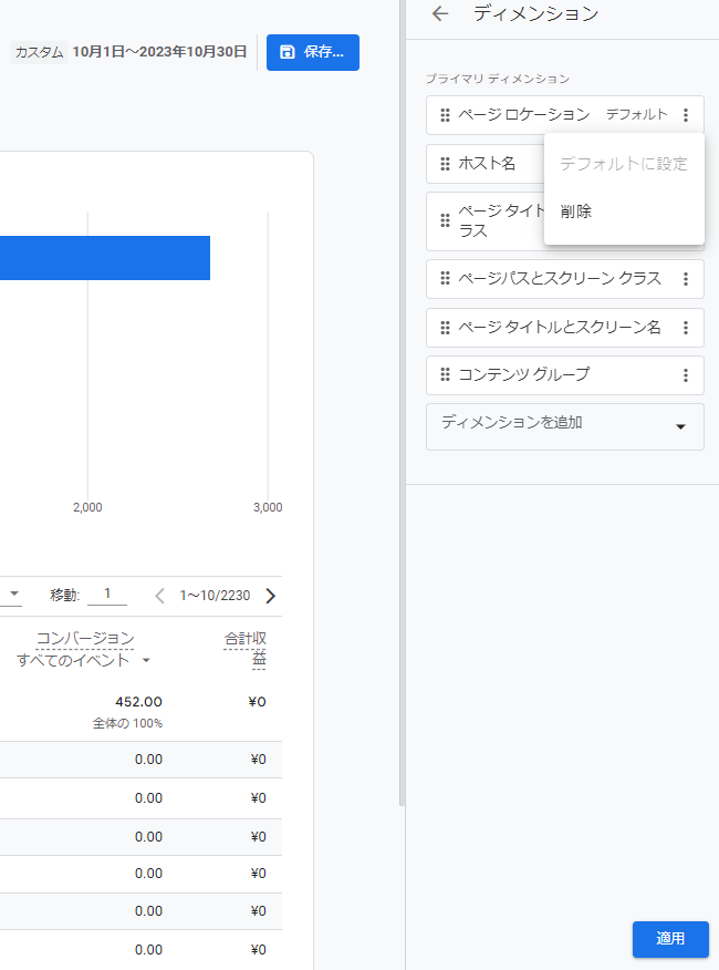 上記の画面にアクセスできたら、下図のように [レポートデータ] の [ディメンション] から「ページ ロケーション」を選択し、 [デフォルトに設定] をクリックしてレポートを適用・現在のレポートへ保存を行います。
