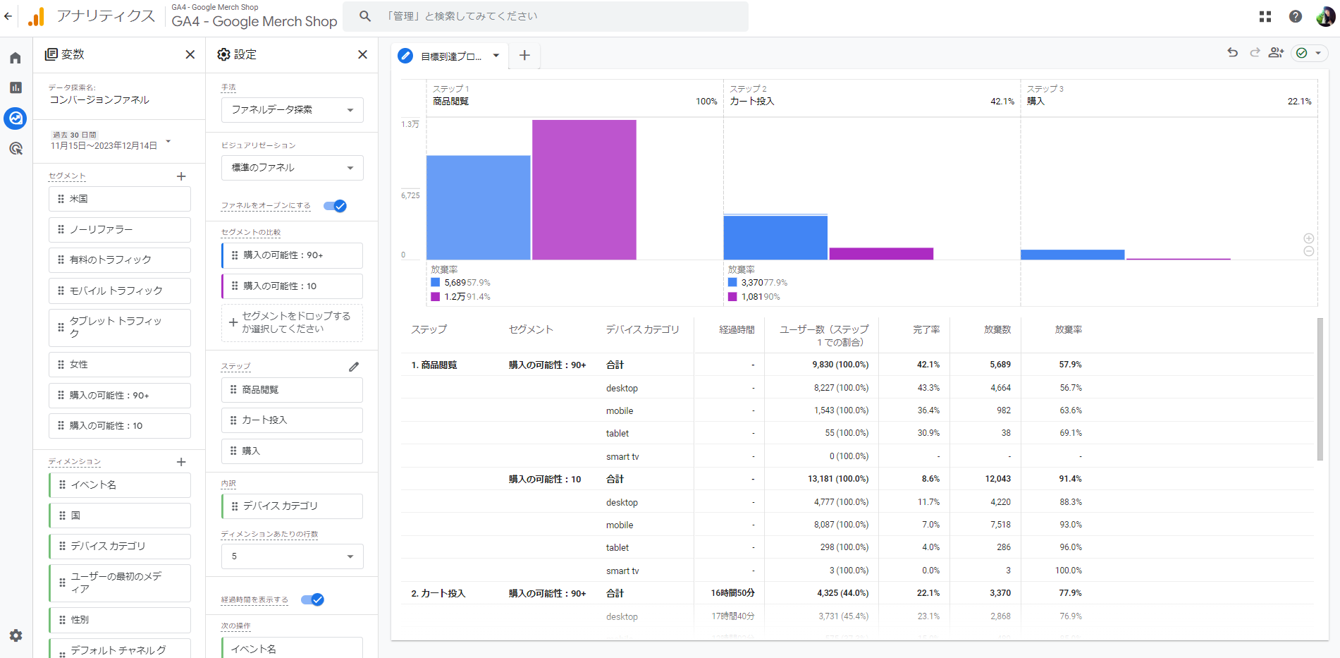 代わりに、 下図のように[探索] にある [ファネルデータ探索] で作成可能です。