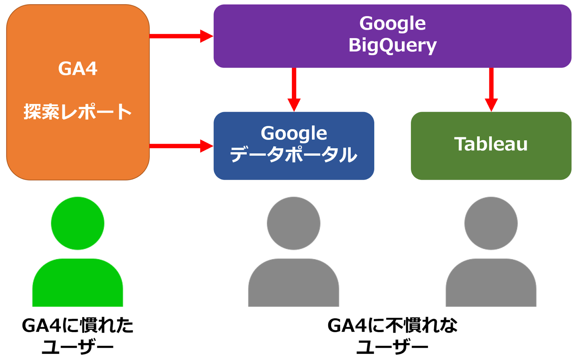 自社のマーケターが、GA4のブラウザUIに慣れており、探索配下のレポートで自在に分析ができる場合は不要です。そうでない場合には、GA4データをもとにGoogleデータポータル(GDP)や、Tableauなどの外部のダッシュボードツールやBIツールで、見やすい形、利用しやすい形に変えてあげて、マーケターはGDPやTableauを参照する。という使い方になるかと思います。