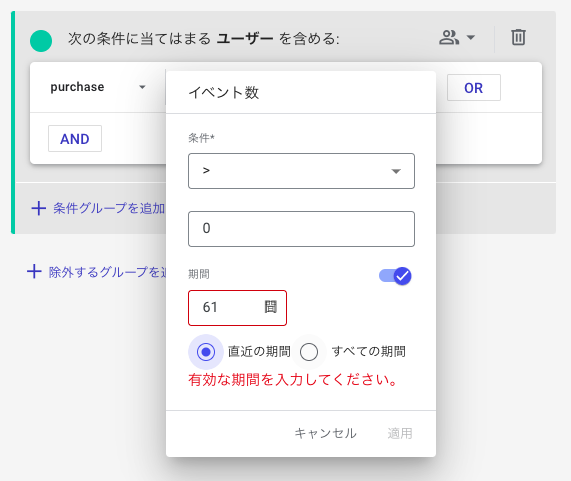 セグメントに含めるイベントの条件において、そのイベントの発生期間を指定する(「期間」オプションで「直近の期間」を選択する)場合、振り返ることができるのは過去60日までという制約があります。そのため、購入サイクルの比較的長い商材を扱うウェブサイトでは定義可能なセグメントが限られる傾向があります。