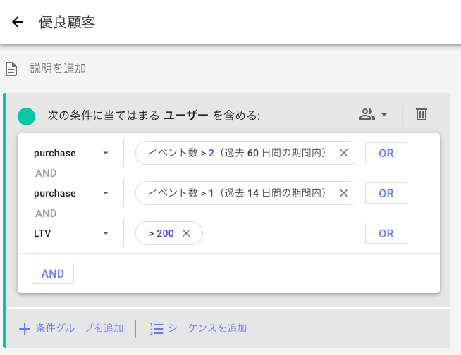 LTVの指標を利用して、ユーザーの購入総額ベースの条件を定義します。