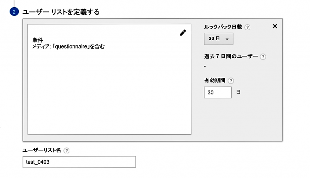 ここでは、サイト流入最終日である3月21日から10日以上経過した4月3日に「メディア:questionnaireから流入したユーザー」のリストを作成します。上記の通りルックバック日数を30日とし、ユーザーリスト名「test_0403」にて保存します。