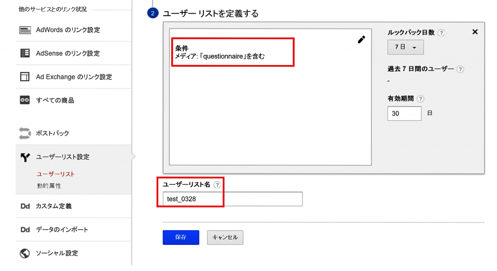 上でも説明しましたが、GAリマーケティングでは、過去10日間にサイトに訪問したユーザーを、リマケリストとして追加できます。そのため今回は、サイト流入最終日に設定した3月21日が「過去10日間」以内となる3月28日に、「メディア:questionnaire」から流入したユーザーを、GAリマーケティングで作成します。ユーザーリストの名前を、「test_0328」にて保存します。