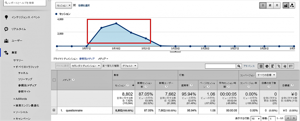 今回は、3月18日~3月21日に「メディア:questionnaire」から流入したユーザーを、①GAリマーケティング、②ルックバックをそれぞれ使うことで、リマケリストとして追加できるのかを検証します。