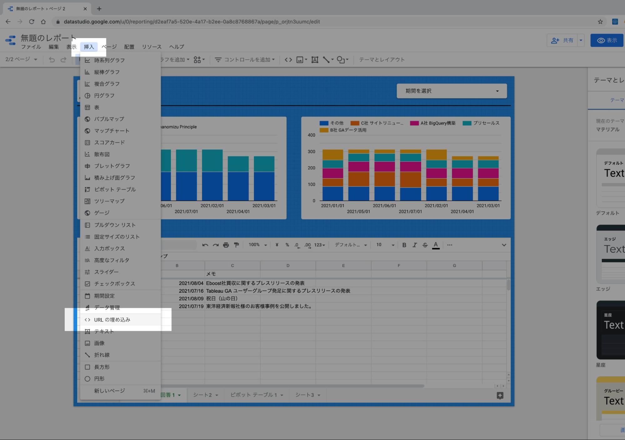 ツールバーの「挿入」から「URLの埋め込み」を選択します。