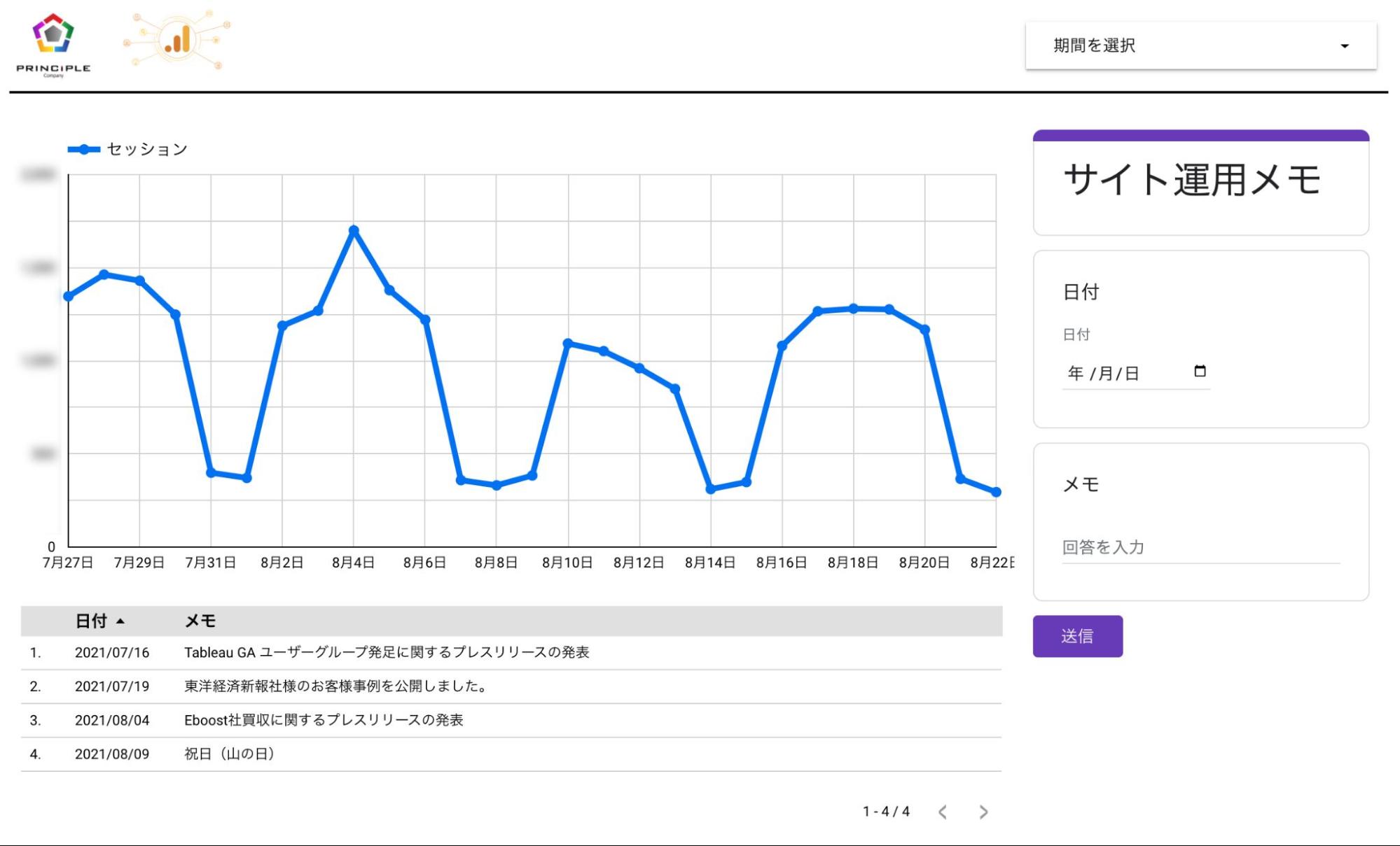 これにより、Googleフォームの「サイト運用メモ」からサイトのリリース情報やプロモーション情報を入力し、送信することができます。送信されたデータはスプレッドシートにエクスポートされるため、データポータルのデータ更新ボタンをクリックするだけで、運用メモ・テーブルにメモした情報が追加されます。