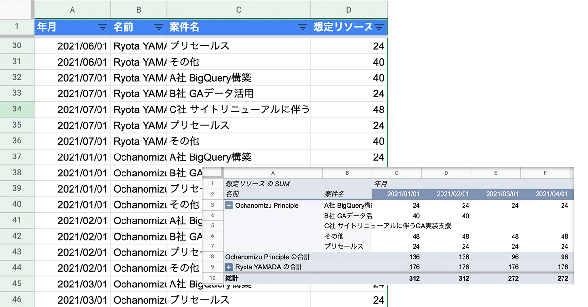 例えば、プロジェクト型の仕事を行っているような会社の場合、リソース管理のためにスプレッドシートを使うケースがよくあります。以下のようなスプレッドシートを作ったことのある人は多くいるのではないでしょうか。