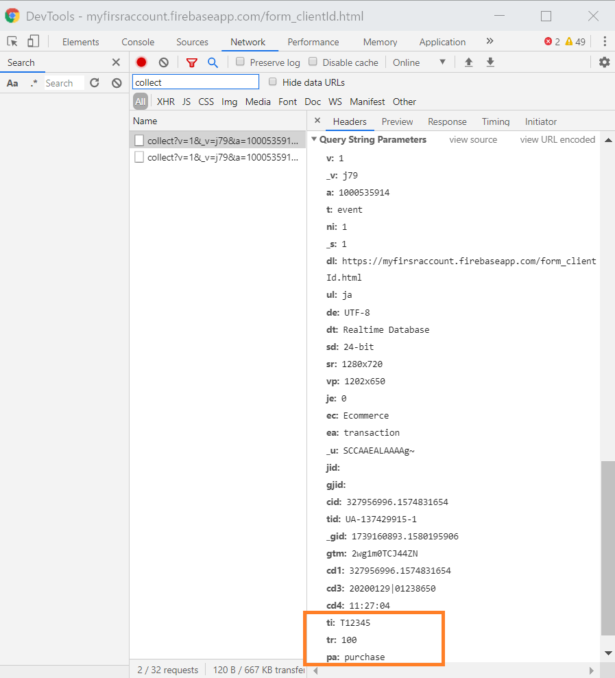 例えばトランザクションのIDは、ビーコンのURLパラメータ名「ti」として送られます(「標準のeコマース」「拡張eコマース」ともに同じ)。したがって、トランザクションの不備を調査するためには、この「ti」がパラメータに存在するか確認します。