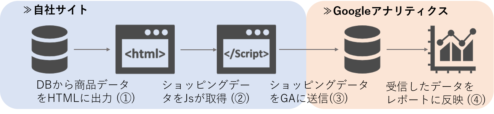 ③Javascriptは取得したeコマースデータをアナリティクスに送信します。