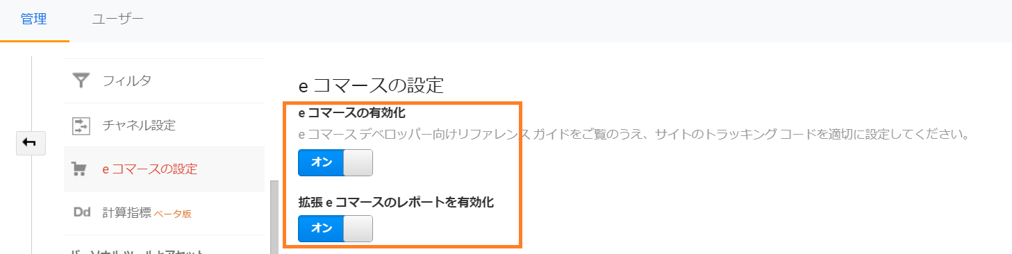 アナリティクスのe コマースの設定では、「e コマースの有効化」をオンにする必要があります。