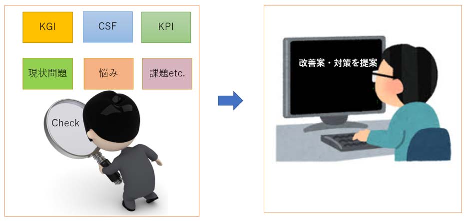 お客様が設定している目標に対して、現状のウェブサイトではどのような問題があるかを調べ、WEBサイト上の課題を発見、改善案や対策を提案します。