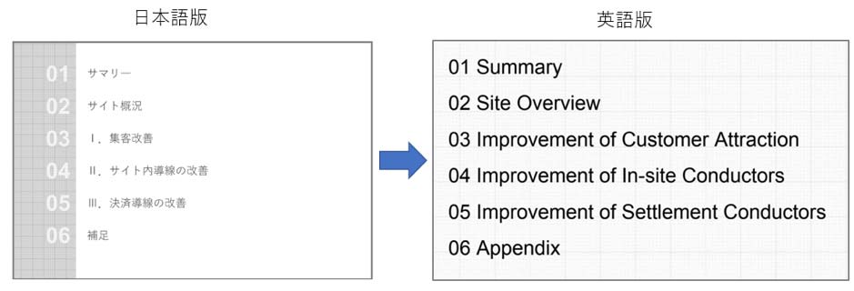 弊社のWEBコンサルティングサービスをご利用して頂いているお客様の中で日本やアメリカなどで複数の国で展開している企業が沢山あるため、「ハイブリッド診断」のレポートは英文化や多国語に翻訳することが必要になります。WEB専門知識を持つ数名の英語ネイティブ社員がおりますので「英語翻訳がとてもクオリティ高く、安心してご依頼できます」との高い評価を頂きました。WEB診断後のアフターサービスも是非ご利用ください。