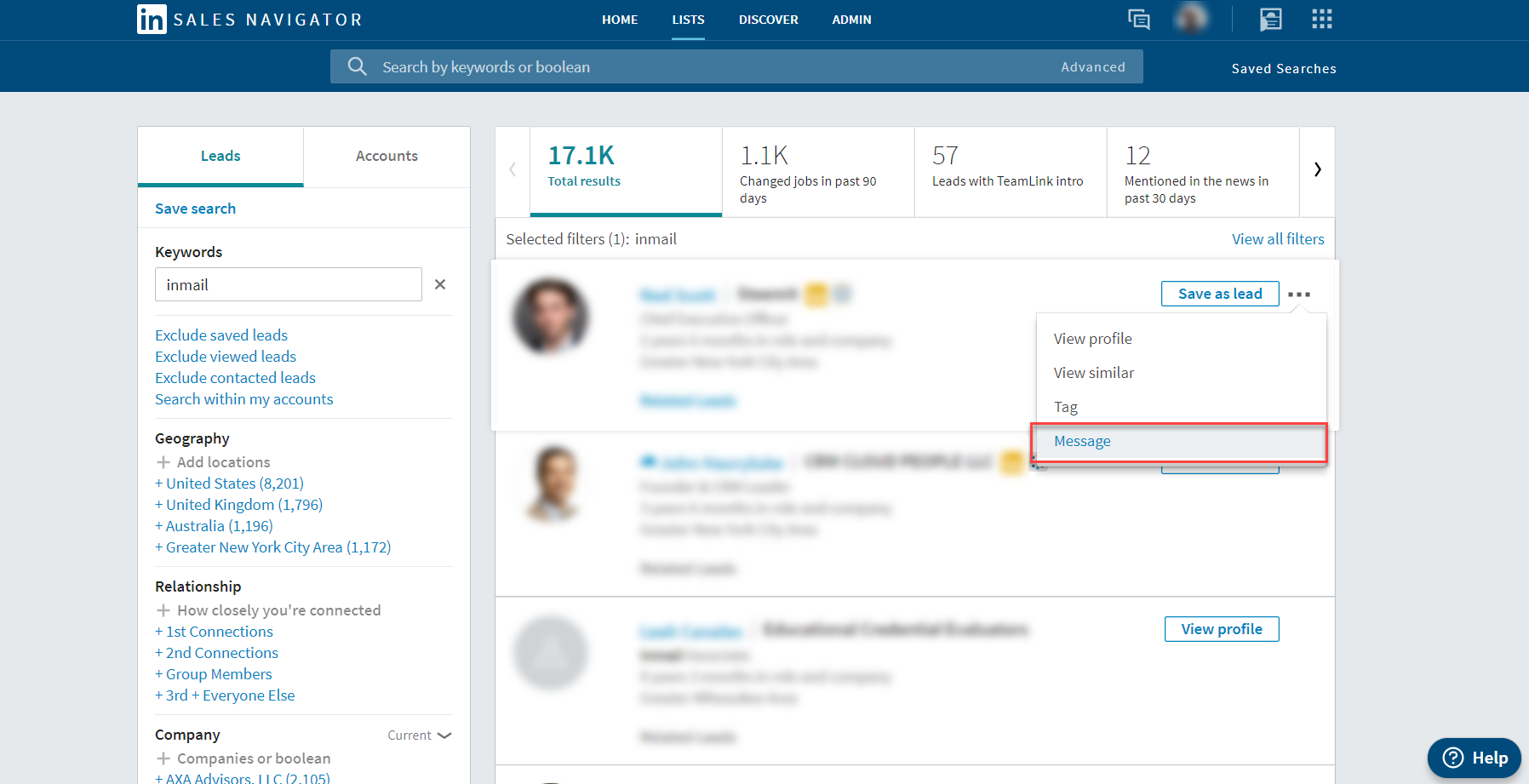LinkedInの無料版では、ネットワーク外の人に直接メッセージを送ることはできません。つまりSales Navigatorでなければ、営業担当者がまだ直接つながっていない新鮮なリードに連絡を取ることができません。InMailメッセージ機能を使えば、営業担当者は自分の直接のネットワーク以外のリードを発見し、関係を構築する機会が増えます。