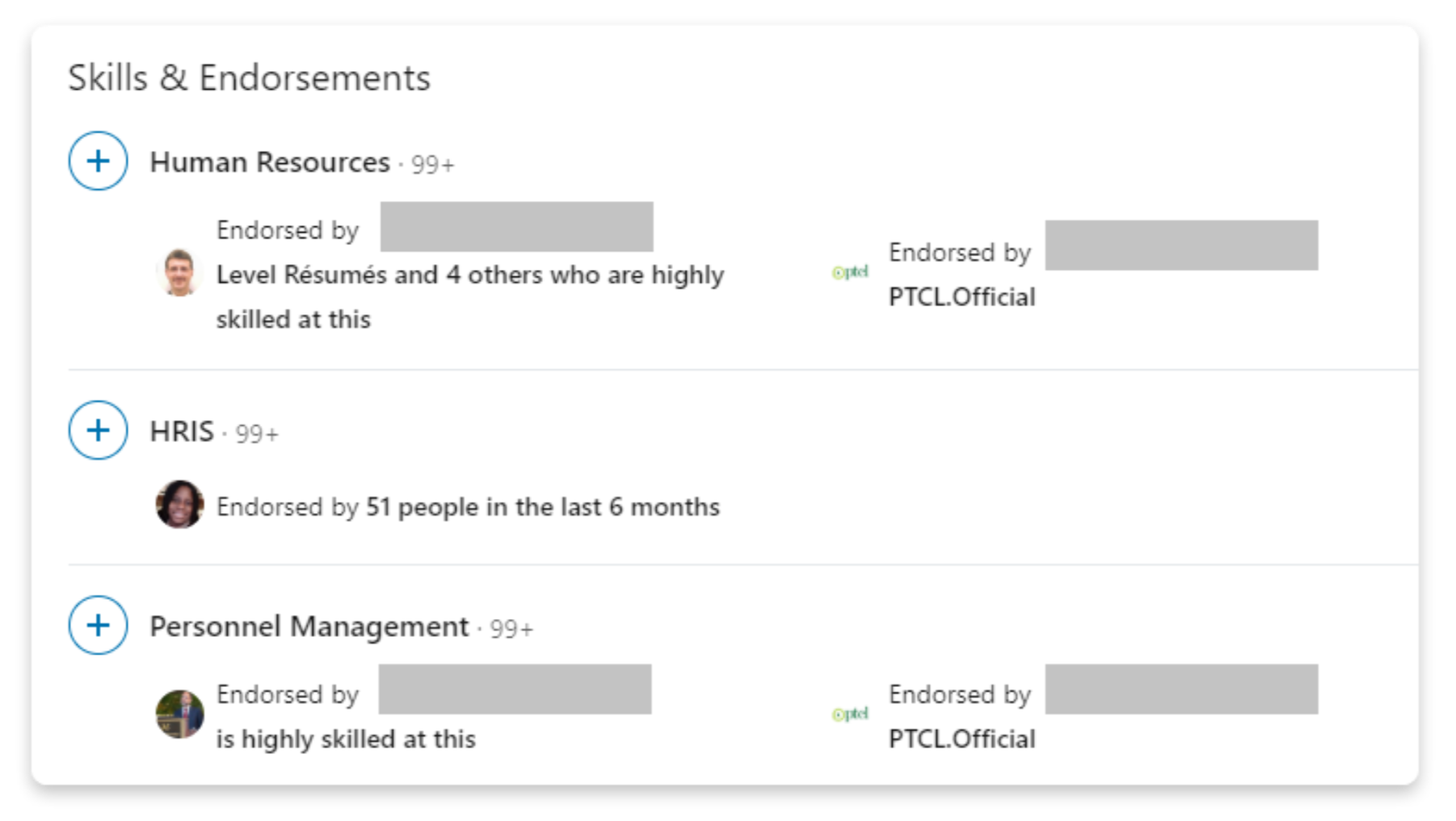 また、クライアント・担当者のページの「Skills & Endorsements」には、その方を推薦してくれた人たちが掲載されており、これも潜在顧客の選択肢になります。