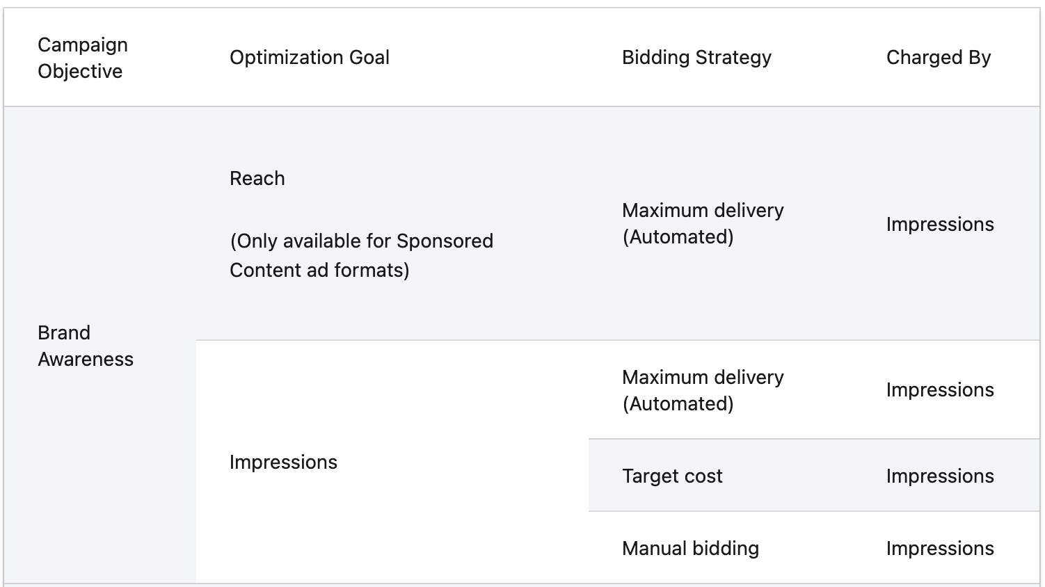 1つ目のBrand awareness(ブランド認知)はその名のとおり、ブランド認知向上に適しています。このキャンペーン目標では、選択した広告フォーマットと入札戦略に応じて、最適化目標としてリーチまたはインプレッションが選択されます。※リーチでの最適化はSponsored Contentのフォーマットに限定(後述)