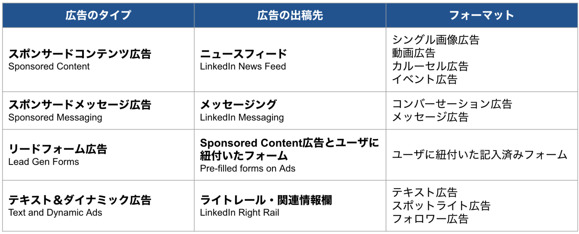 LinkedIn広告には「Sponsored Content」「Sponsored Messaging」「Lead Gen Forms」「Text and Dynamic Ads」の4つの広告タイプがあります。詳細は公式ガイドをご参照ください。