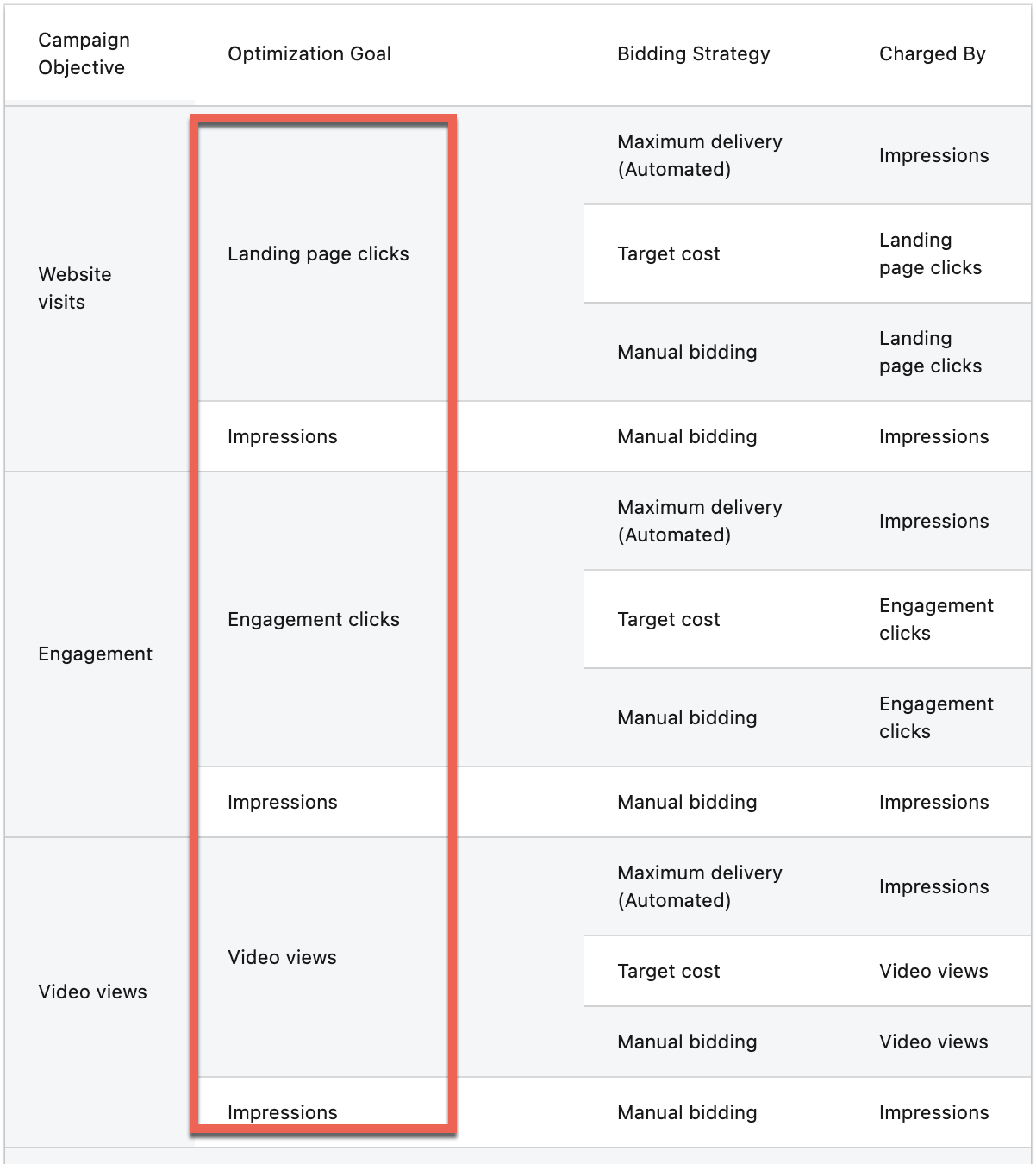 これはキャンペーン目的によって最適化の指標(KPI)が異なることに起因しています。例えば、「Engagement」を目的としたキャンペーンの目標指標には、広告のインプレッションやEngagement Clicks(=いいね!、コメント、シェアー、ページフォロー、LPへのクリックなど)があります(下図参照)。