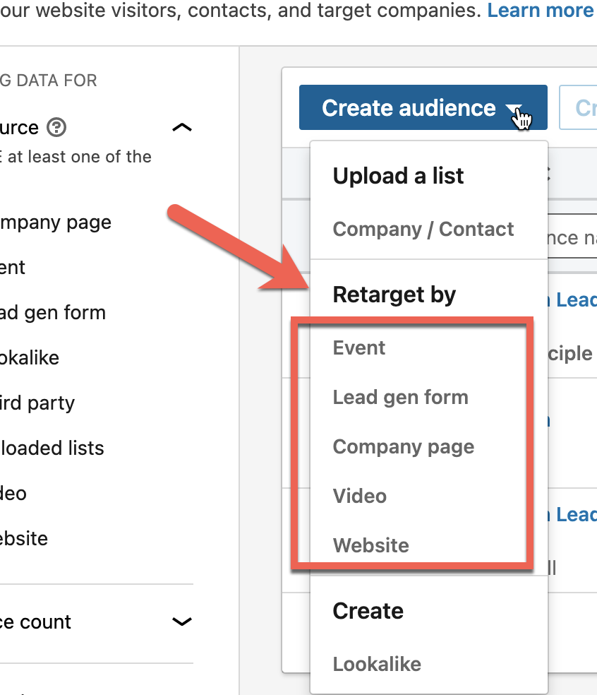 このリターゲティング機能は、ウェブサイトへの訪問、イベントへの登録、動画の視聴、リードジェンフォームへの入力など、すでに製品やサービスに興味を示している既存のLinkedInメンバーをターゲットとする機能です。