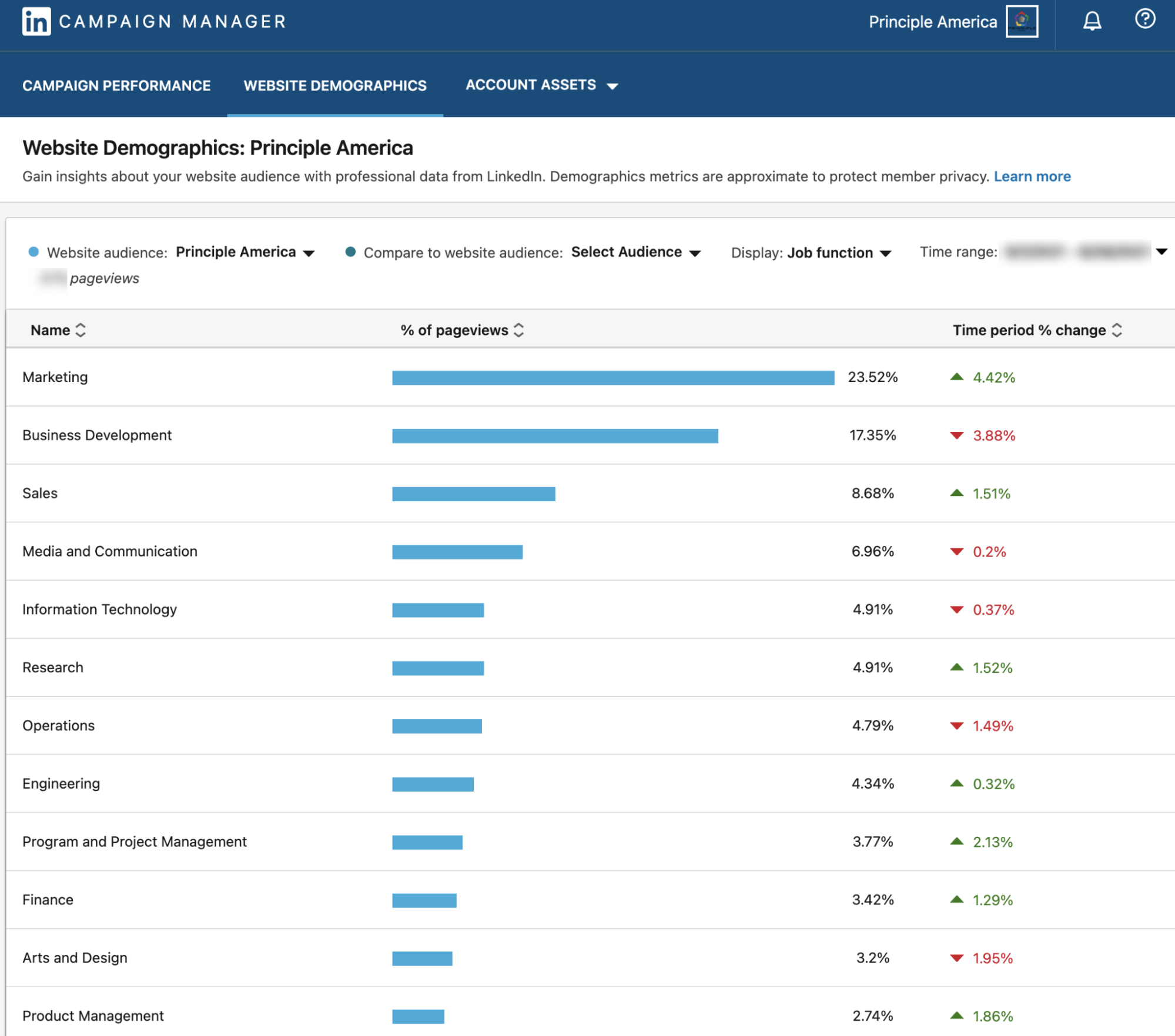 また、インサイトタグの設定によりWebsite Demographicデータが有効になります。Website Demographicsを利用すると、ランディングページを訪れている上位の職能を特定することができ、リーチやエンゲージしているユーザの属性がわかります。