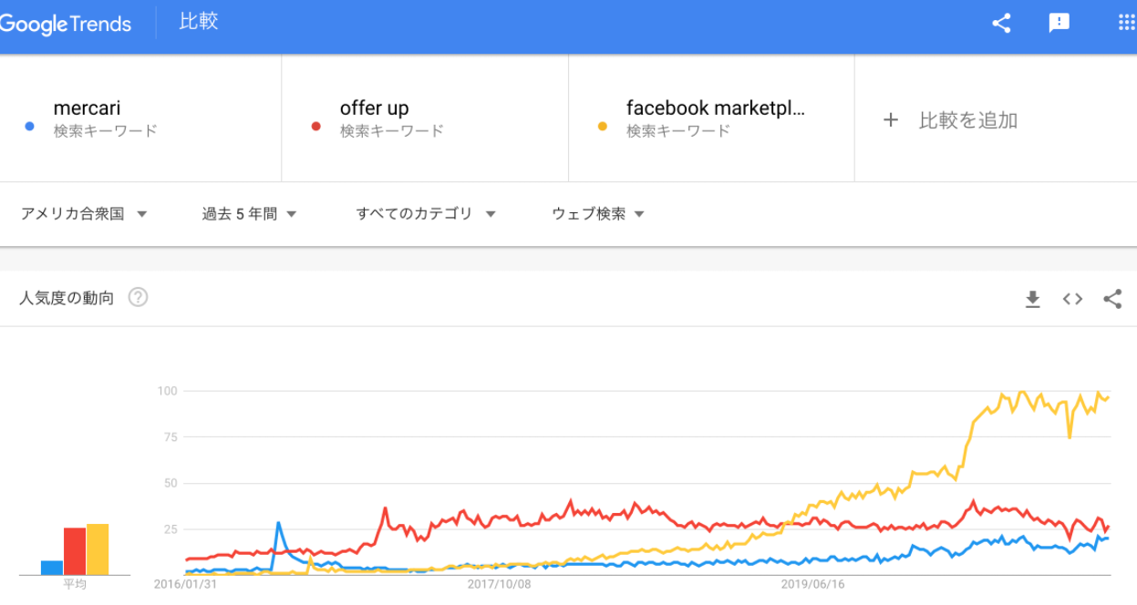 米国メルカリをGoogle Trendsで見ると、米国市場に参入した時は宣伝広告をかけることで知名度をあげた時期があったが、後発のFacebook Marketに抜かれ、最大手eBayもいる中で苦戦をしている。