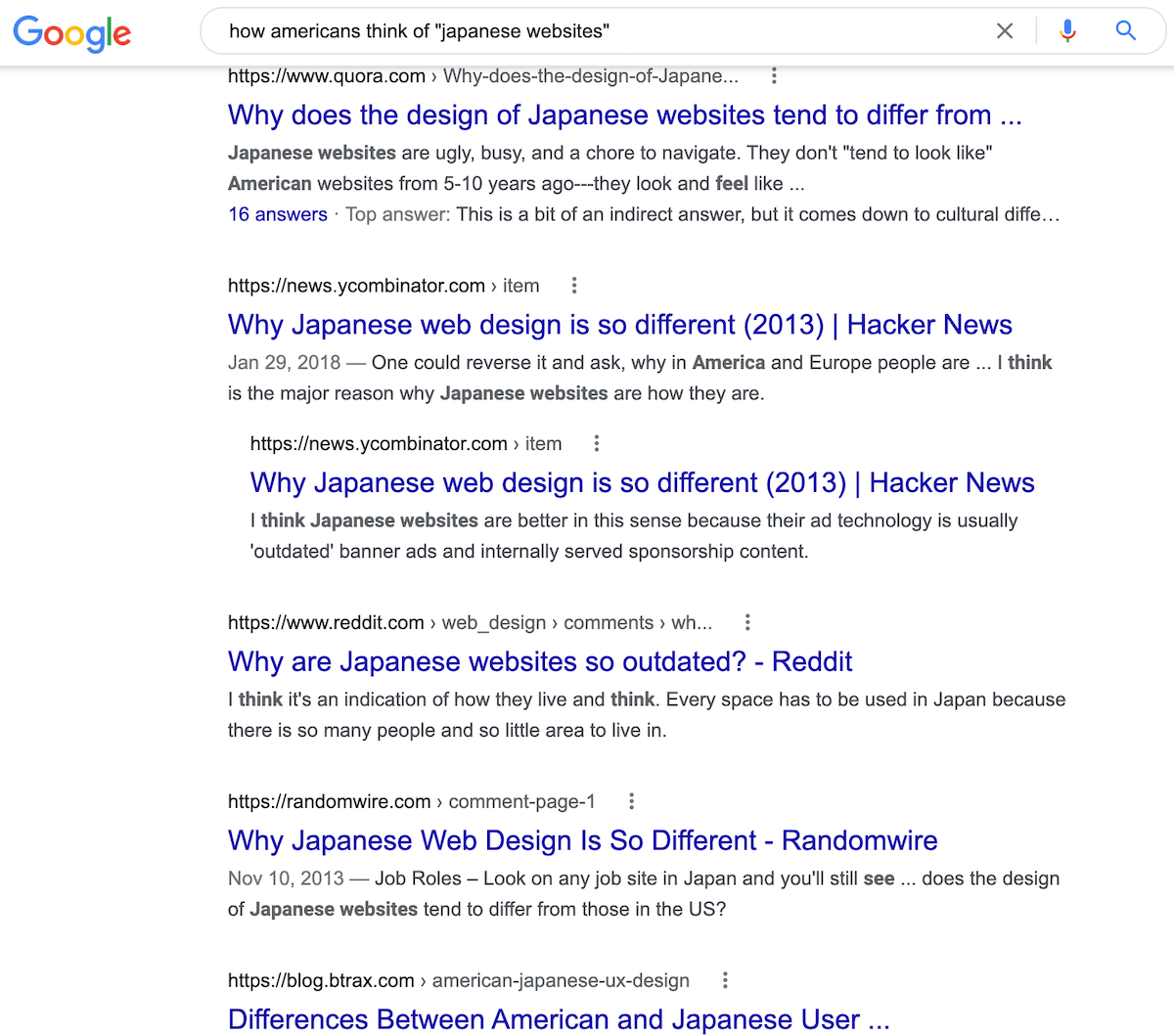 たとえば、日本のウェブサイトのデザインはアメリカ人にはウケが悪く、対策が必要です(「アメリカ人が日本のウェブサイトをどう思うか」を検索すると、大半が「なぜ時代遅れなのか?」「なぜ違うのか?」「乱雑」という内容です)。