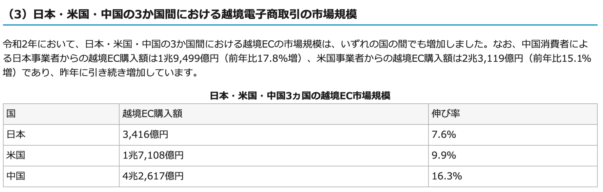 冒頭でも書いたとおり、いわゆる「越境EC」への注目が高まっており市場規模が拡大しています。経済産業省のデータによると、越境ECの購入額は令和2年、日本・米国・中国の3ヶ国間で増加しています。