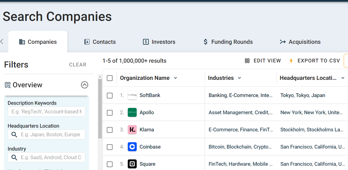 まず、企業データベースの記載がある「crunchbase.com」をメインに利用して、Target企業を抽出した。