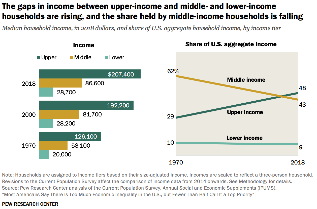 アメリカでは近年、高所得層と中所得者層及び低所得者層の所得差が大きく開いています。中所得層は減少した一方で高所得層は増加し、低所得者層はほぼ横ばいとなりました。