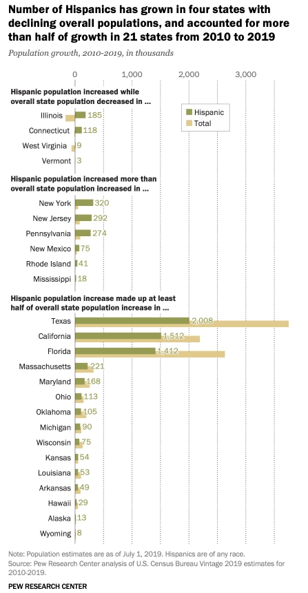 参考:Where the U.S. Hispanic population grew most, least from 2010 to 2019 | Pew Research Center