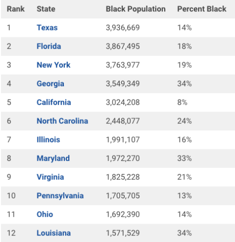 各州の黒人の人口と割合(BlackDemographics.com より)