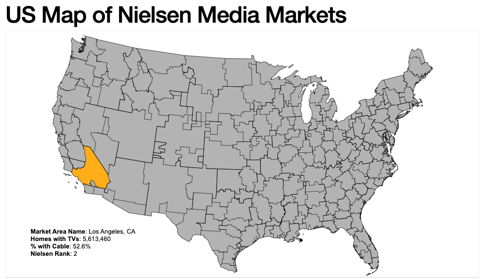 DMA(Designated Market Area)は、ニールセン社によってローカルテレビ視聴が測定されている米国内のエリア区分です。全部で210のDMA区分があり、アメリカ大陸全体、ハワイ、アラスカの一部をカバーしています(DMAの境界線とDMAデータはニールセン社が独占的に所有。)。