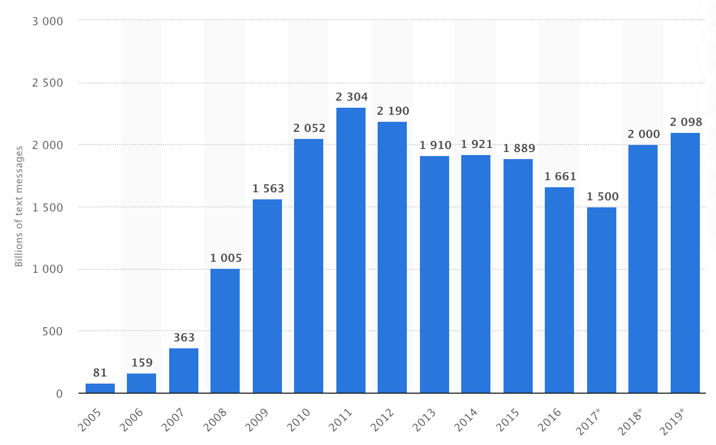 Total number of text messages sent in the United States from 2005 to 2019