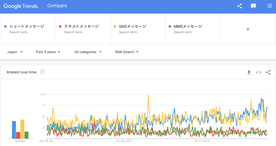 テキストメッセージ関連のキーワードでの検索件数も増加傾向にあります。過去5年間でGoogle検索された「ショートメッセージ」「テキストメッセージ」「SMSメッセージ」「MMSメッセージ」の推移は下図のようになっています。