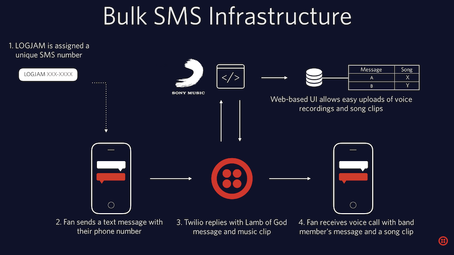 「LOGJAM」はTwilioのバルク音声およびSMS通知ソリューションを利用した、音声ベースの自動応答プラットフォームです。ファンがSMSメッセージを送ると、Lamb of Godの新曲クリップとボイスメッセージを受け取れます。